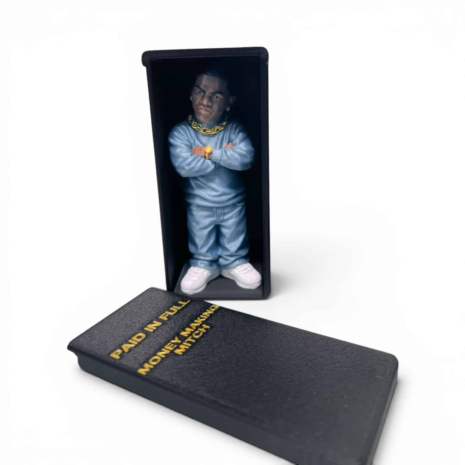 This collectible features Mitch in his iconic outfit, complete with detailed accessories like his chain, watch, and confident crossed-arm pose. It also includes a custom display case with “Paid in Full – Money Making Mitch” lettering, making it perfect for showcasing.